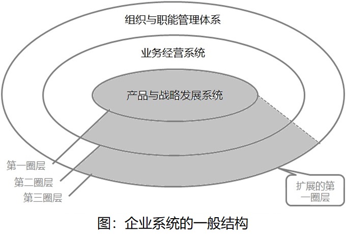 我把企业系统的一般结构(功能结构)分为三个圈层,见下图。其中灰色区域,是扩展的第一圈层,也即企业的创新功能区和战略发展的功能区;没有这个功能,不可能有创新和战略发展。企业创新与战略发展能力与该功能区的规模和质量直接相关。该功能的展开,不同企业可能不同,但创新和领导力都是必须的构成。